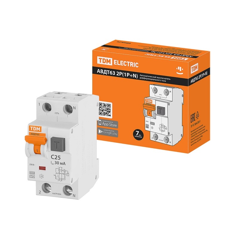 Автомат дифференциальный TDM АВДТ 63 6 кА, С 25А, 30 мА, тип А, 1P+N
