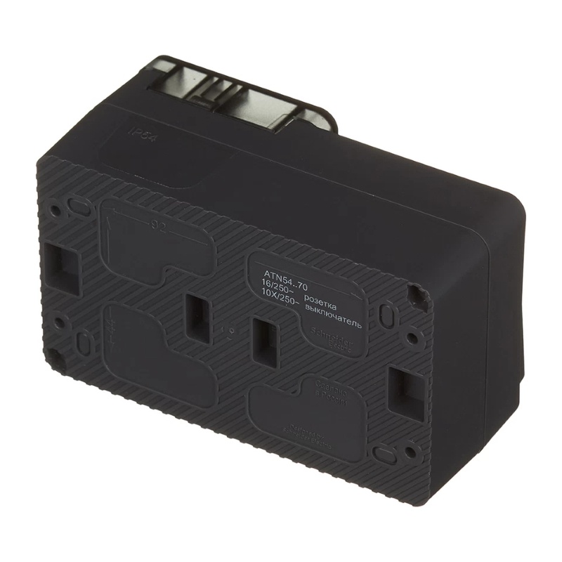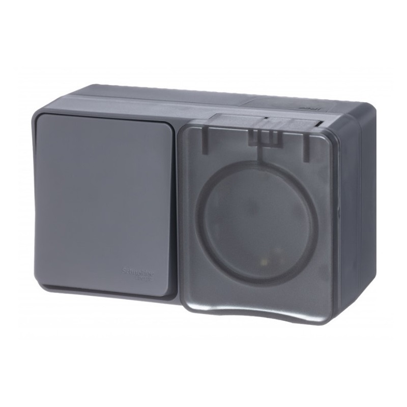 Предназначен для открытой установки. Серия AtlasDesign Profi54 создана специально для тех мест, где требуется повышенная защита от влаги и пыли. Блок состоит из одноклавишного выключателя и розетки с заземлением, шторками и крышкой.