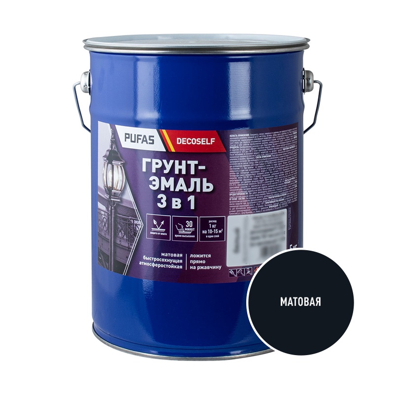 Pufas Decoself 3 в 1 — быстросохнущая грунт-эмаль для защиты и окраски чистых, ржавых или частично прокорродировавших металлических поверхностей. Подходит для наружных и внутренних работ, включая решетки, ограды, гаражи, металлоконструкции, а также элементы автомобилей (днище, пороги и др.).