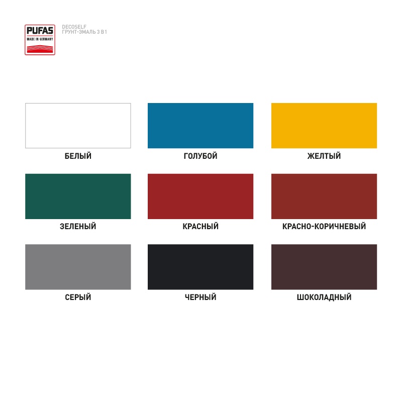 Pufas Decoself 3 в 1 — быстросохнущая грунт-эмаль для защиты и окраски чистых, ржавых или частично прокорродировавших металлических поверхностей. Подходит для наружных и внутренних работ, включая решетки, ограды, гаражи, металлоконструкции, а также элементы автомобилей (днище, пороги и др.).
