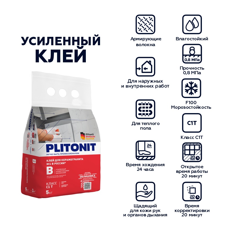 Клей для плитки усиленный Plitonit В для наруж/внутр работ (5 кг)