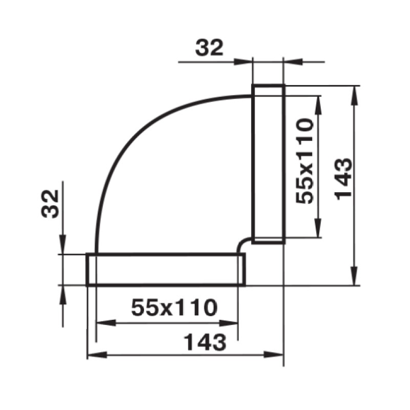 Предназначен для соединения плоских вентиляционных каналов размером 110х55 мм в горизонтальной плоскости под углом 90 градусов.