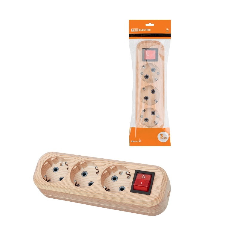 Колодка 3 гнезда, с/з и выключателем, 16А, светлое дерево