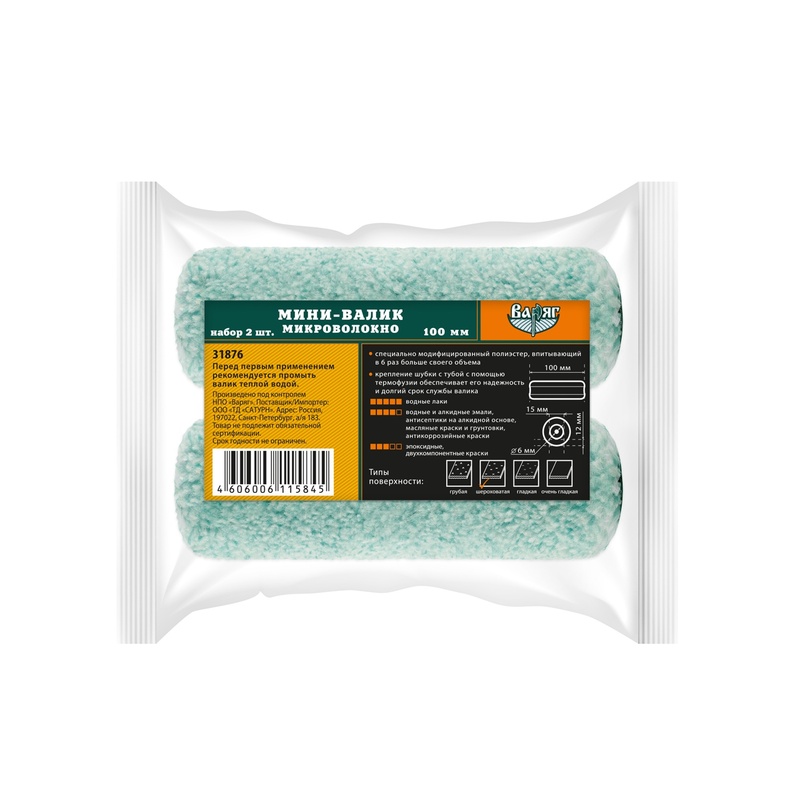 Мини-валик микроволокно Варяг 31876 ворс 12 мм, 100 мм (2 шт)