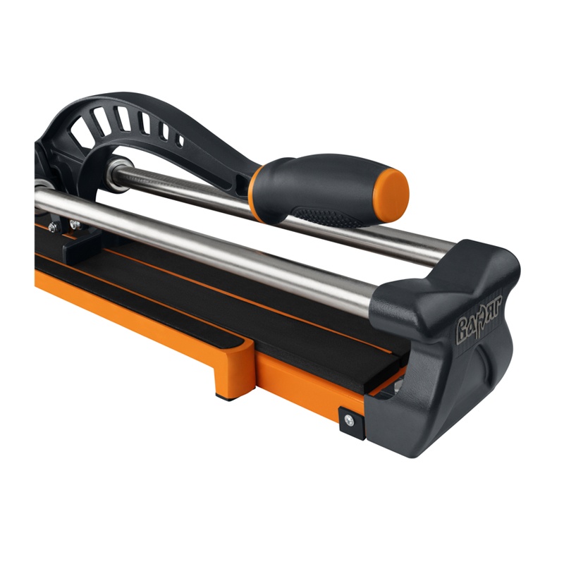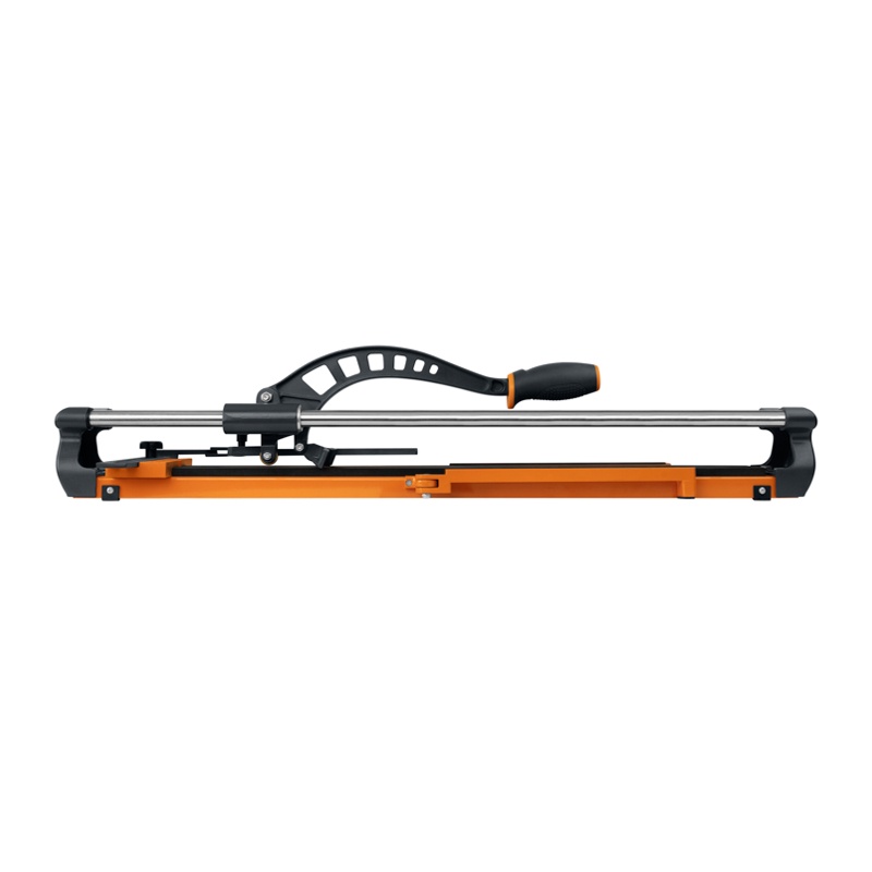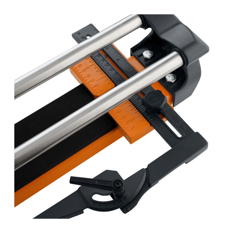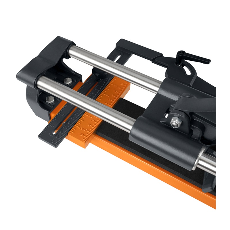 приводящих к неровному резу. Рабочий стол с боковыми упорами позволяет резать плитку до 660 мм. Твердосплавный режущий ролик на основе карбида вольфрама ВК8 обеспечивает рез плитки толщиной до 14 мм. Вращающаяся линейка с системой быстрой фиксации для реза под любым углом. Сменный ролик - арт. 55187.