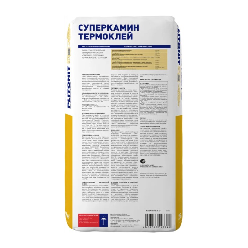 Термоклей Plitonit СуперКамин для облицовки печей и каминов, 25 кг