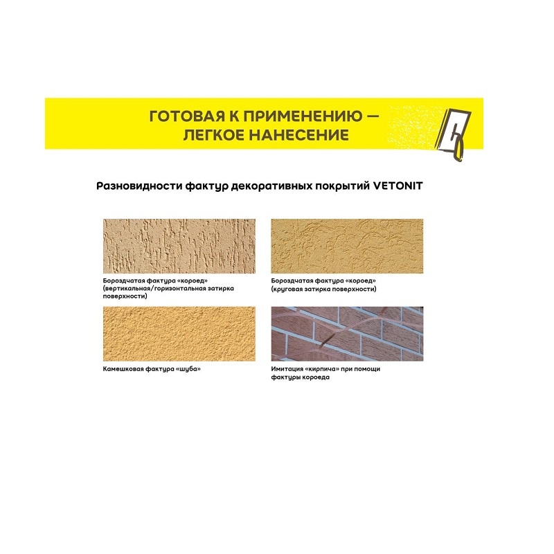 Предназначена для работ при отрицательной температуре до -10 °С. Подходит для декоративной отделки стен внутри и снаружи помещений, с последующей окраской вододисперсионными красками. Является негорючим и безопасным материалом. Обладает хорошей паропроницаемостью и морозостойкостью.