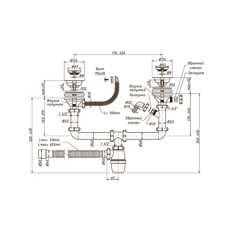 Сифон бутылочный Orio А-40092, 3 1/2"х40мм, решетка d=114мм, перелив, отвод