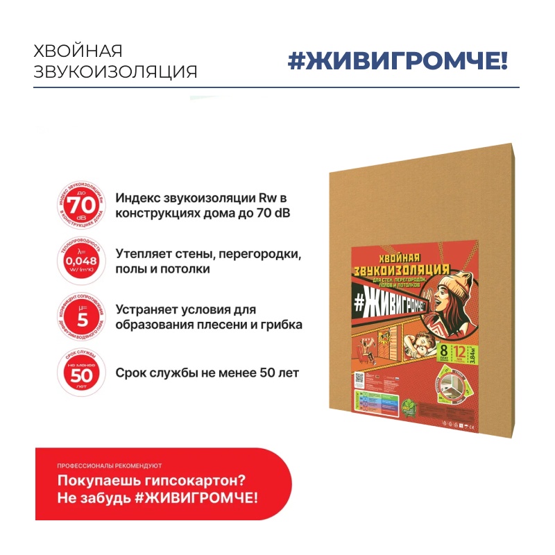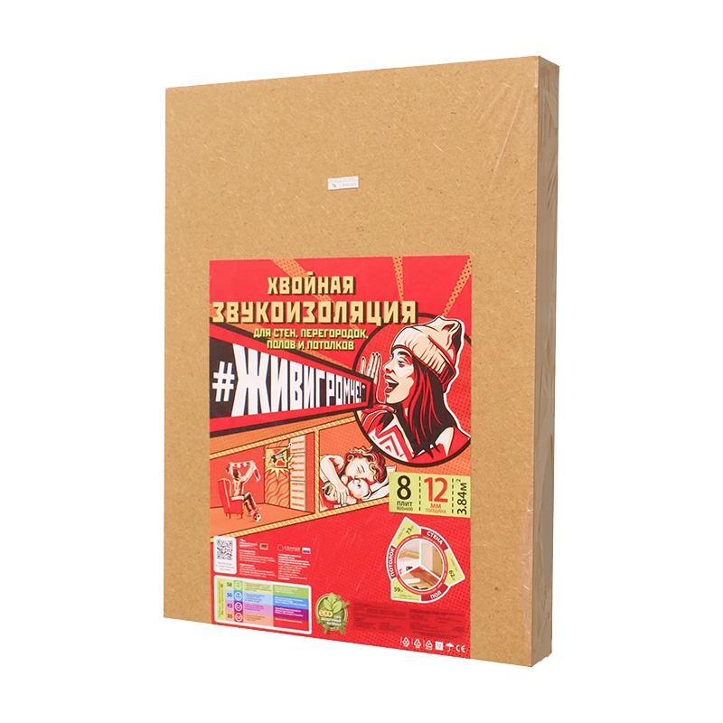 Предназначена для простой, экономной и эффективной звукоизоляции помещений и изготовлена из древесного волокна лесной сосны в виде плит разного размера.